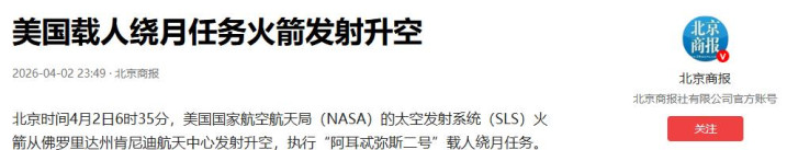 4月2日清晨,美国SLS火箭搭载着“猎户座”飞船从肯尼迪航天中心轰鸣升空。